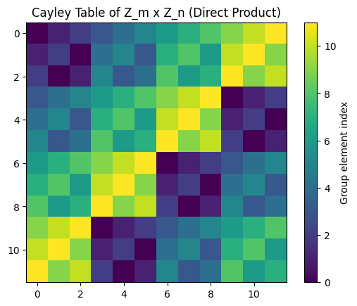 This heatmap illustrates how group elements combine under the direct product operation, helping us see structural properties such as cyclicity.