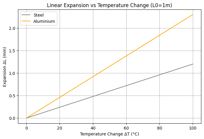 This graph shows aluminium expanding almost twice as much as steel across the same temperature interval, demonstrating how both material properties (α) and temperature change (ΔT) affect expansion.