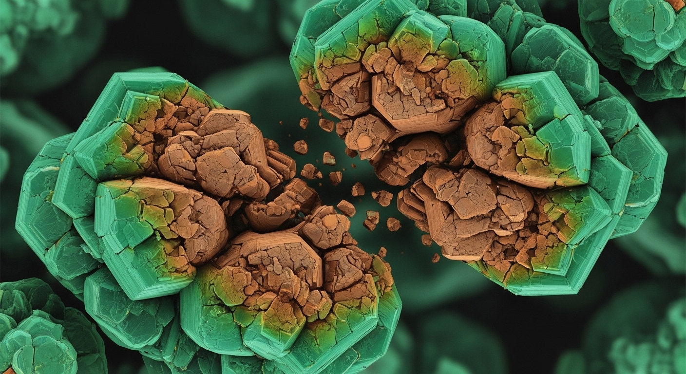 One specific degradation product identified in high-humidity environments is a distinct copper arsenate hydrate phase. The transformation involves the migration of arsenic ions out of the original crystal structure. In the presence of moisture, the semi-soluble arsenite groups dissolve and re-precipitate as arsenolite (## \text{As}_2\text{O}_3 ##) on the surface, leaving behind a copper-rich, darker residue.